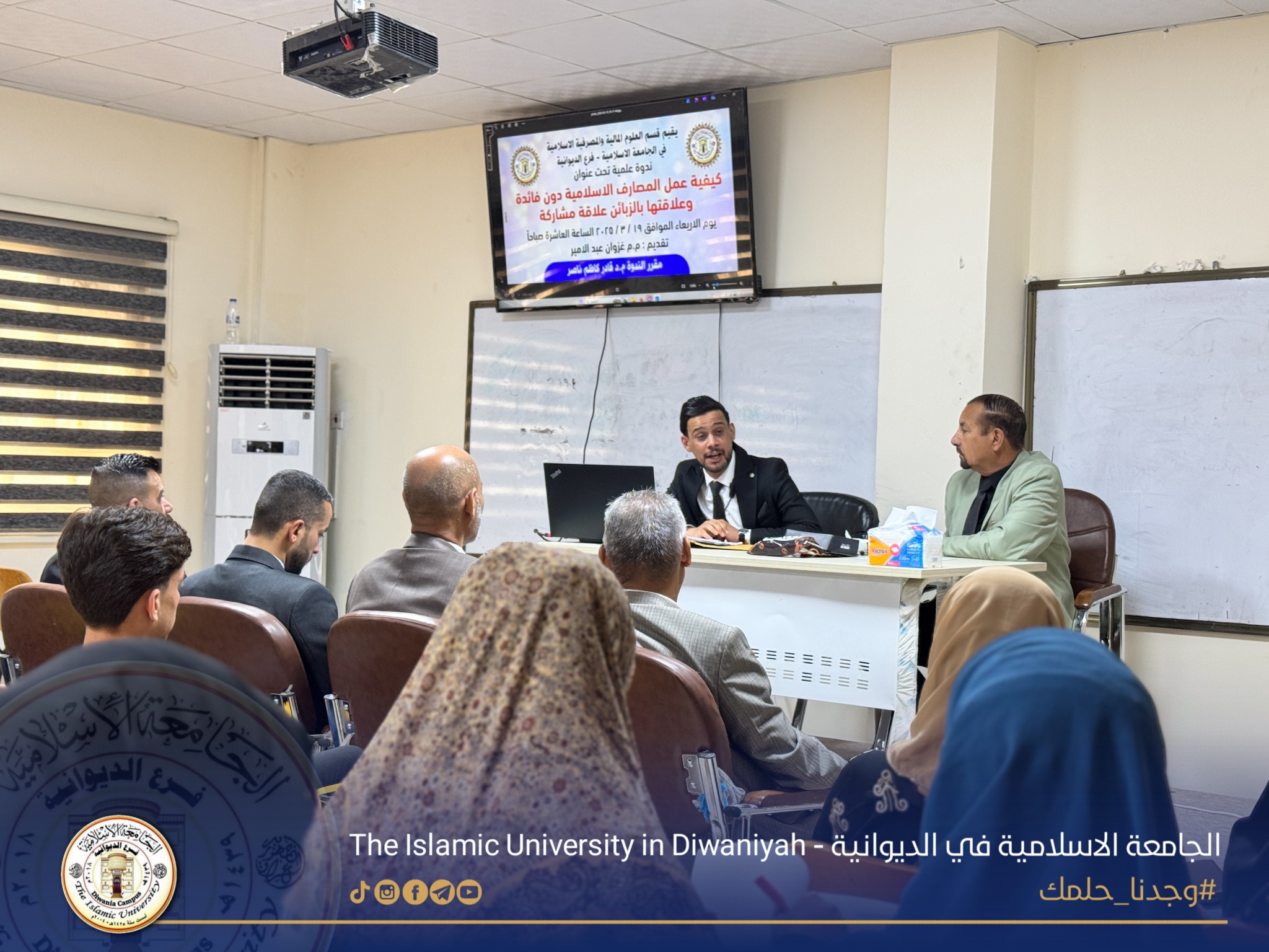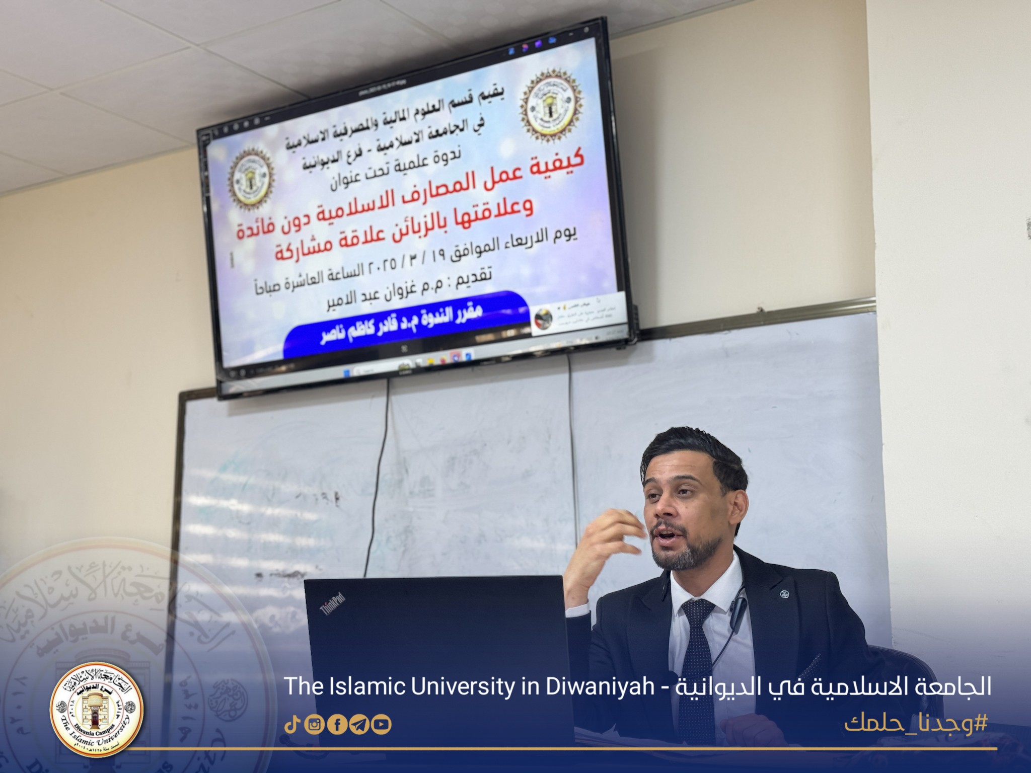 بإشراف من قبل السيد المعاون العلمي المحترم لرئيس الجامعة الاستاذ المساعد جلال علي هاشم وبحضور المعاون الاداري المحترم الدكتور إبراهيم صالح كاظم، قسم العلوم المالية والمصرفية الإسلامية في الجامعة الإسلامية فرع الديوانية يقيم ندوة علمية بعنوان (كيفية عمل المصارف الإسلامية دون فائدة وعلاقتها بالزبائن علاقة مشتركة) والتي قدمها مدرس مساعد غزوان عبدالامير ومقرر الندوة م. د. قادر كاظم ناصر، وبحضور الكادر التدريسي وطلبة القسم..