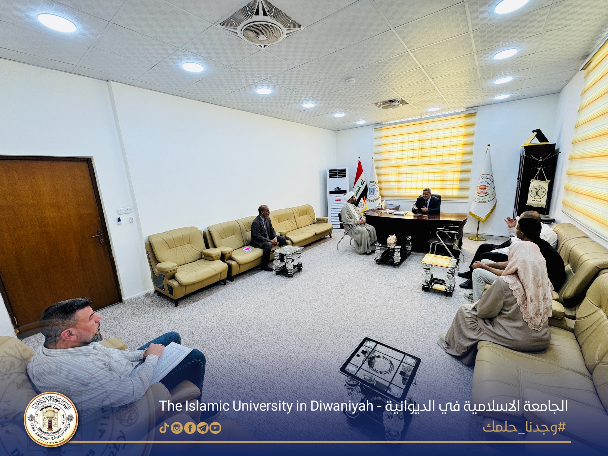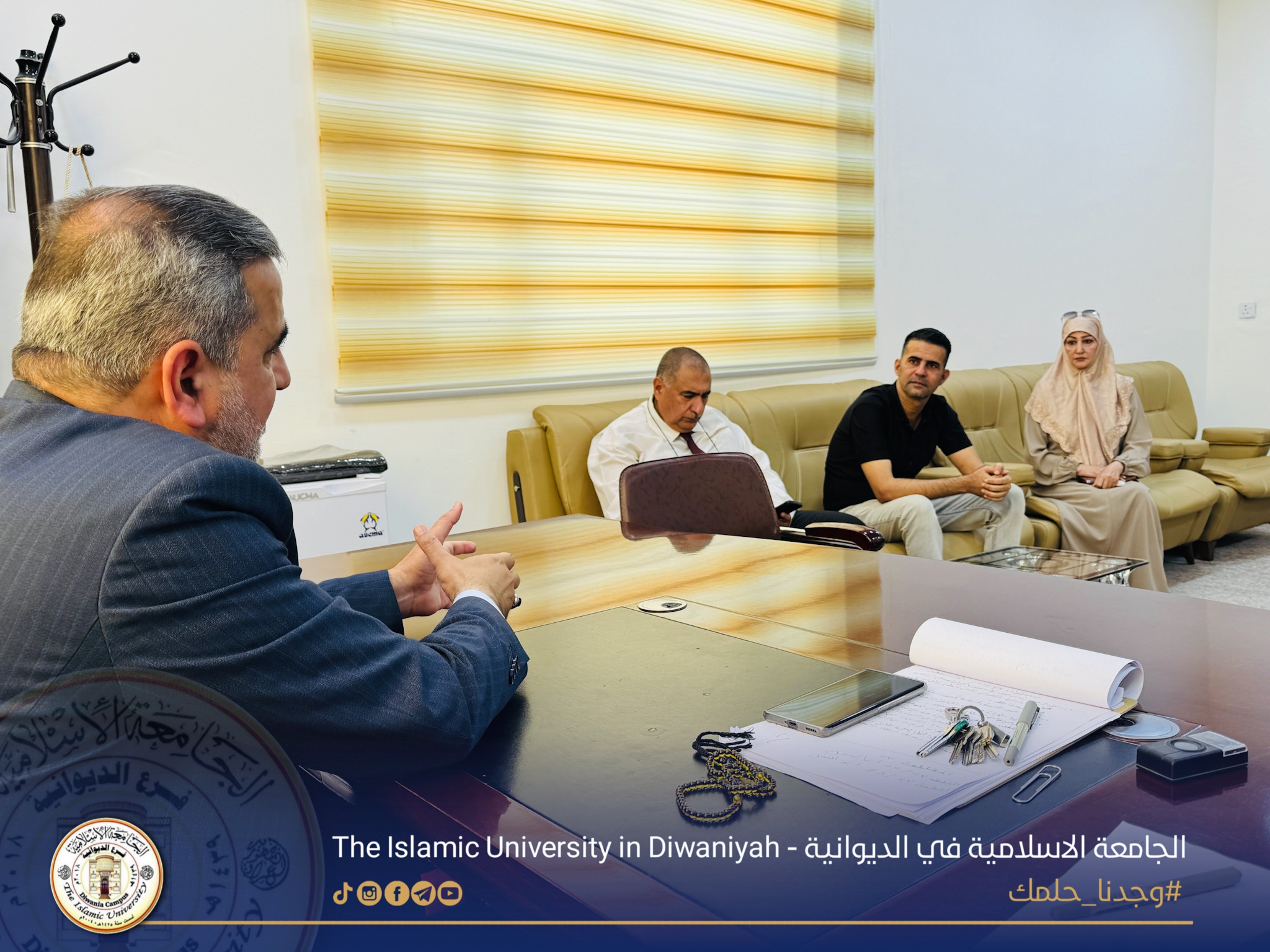 وقد بين لهم مراحل متابعة اكمال الوثائق من الجامعة والوزارة والجهات الاخرى واوضح لهم عمل لجان التدقيق التي تمر بها العملية وآليات صحة الصدور وكيف أن أغلب الخريجين قد منحوا وثائق التخرج وبقيت حالات قليلة يتطلب تواصل الطالب مع التسجيل أو الجهات المانحة لغرض اكمال إطلاق وثيقته وكذلك التعاون معا في الحصول على صحة صدور الوثائق الصادرة من الوقف الشيعي لبعض الخريجين الذين لم تطلق وثائقهم بعد وقد بين لهم بأن هناك قاعدة معلومات كاملة في تسجيل الجامعة في الديوانية وطلب منهم مراجعة مدير التسجيل قبل الذهاب إلى التسجيل المركزي في النجف الاشرف وذلك لتقليل الجهد وتسهيل عملية المتابعة لبعضهم هذا وقد حضر اللقاء السيد المعاون الإداري والسيد مدير التسجيل والسيد مسؤول الإرشاد في الجامعة وفي نهاية اللقاء شكر الأخوة الخريجين السيد رئيس الجامعة والسادة الحاضرين على حسن استقبالهم والاهتمام بطلباتهم والحرص على تميز الطالب والخريج في الجامعة الإسلامية في جميع المجالات كونهم الثمرة التي تفتخر بها الجامعة والمستقبل الذي يبني بلدنا العزيز..