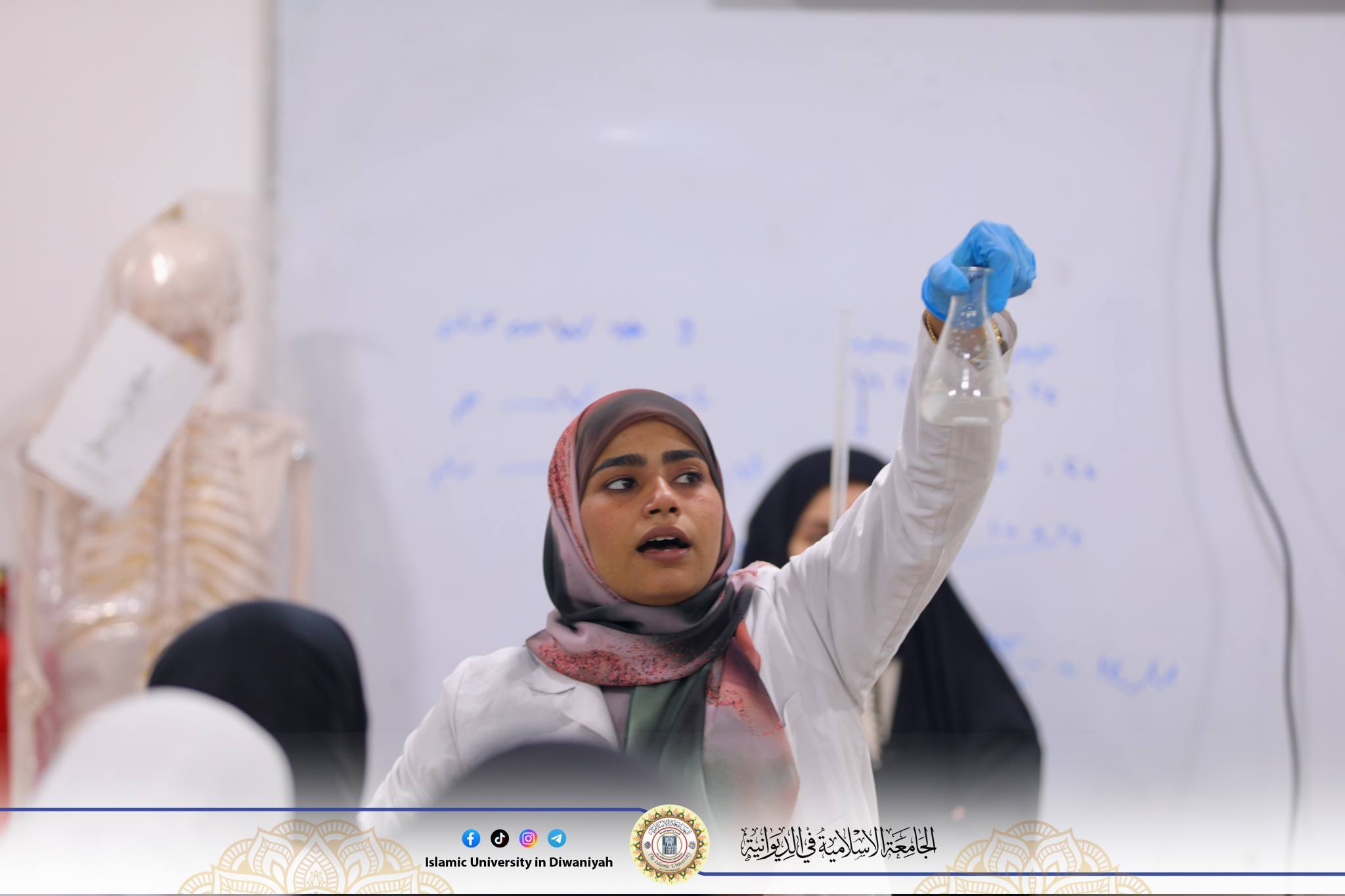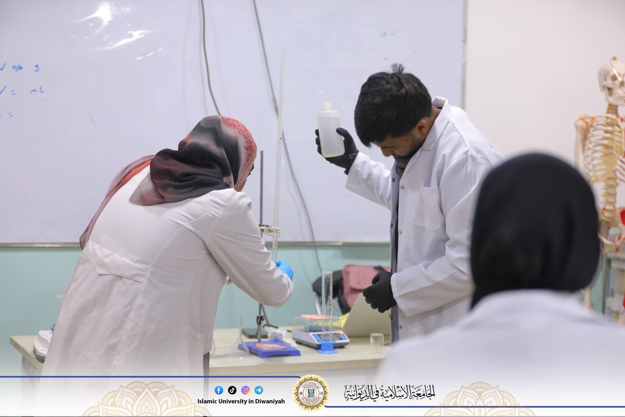 ضمن النشاطات العلمية لمادة الكيمياء المختبرية، تم تقديم محاضرة مختبرية بعنوان Dilution Law (Preparation of Diluted Solutions) لطلبة المرحلة الأولى، قدّمتها م.م زهراء عودة شمام التدريسية في قسم الأشعة، والموظفة إسراء رزاق مسؤولة مختبر الكيمياء، حيث هدفت المحاضرة إلى تعريف الطلبة بمفهوم التخفيف وأهميته في العمل والتحاليل الكيميائية، مع شرح الأساس النظري لقانون التخفيف وتوضيح العلاقة بين التركيز والحجم وفق المعادلة.